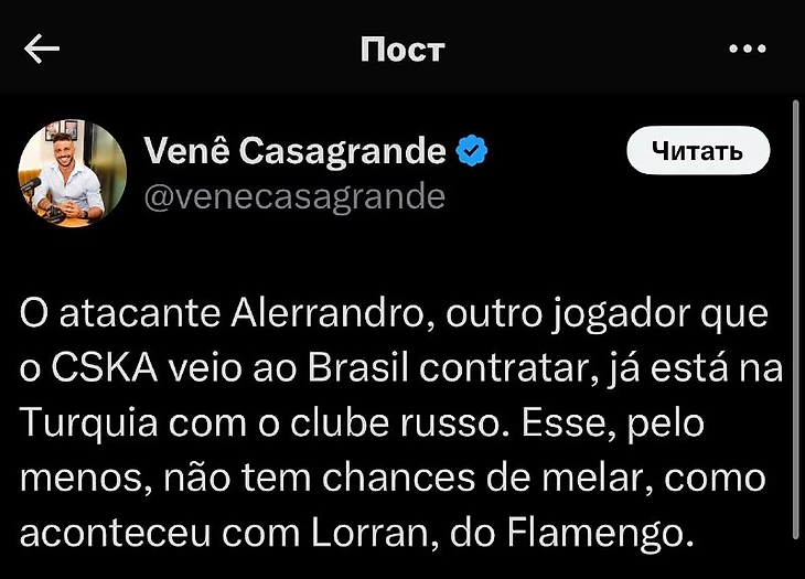 «Алеррандро уже находится в Турции в составе российского клуба. По крайней мере, у этого варианта нет шансов потерпеть неудачу, как это произошло с Лорраном из «Фламенго»