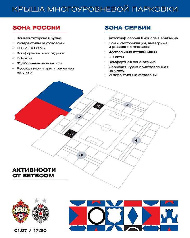 Фан-зона арены будет разделена две зоны — России и Сербии и расположится на крыше многоуровневой парковки напротив секторов 209/210.