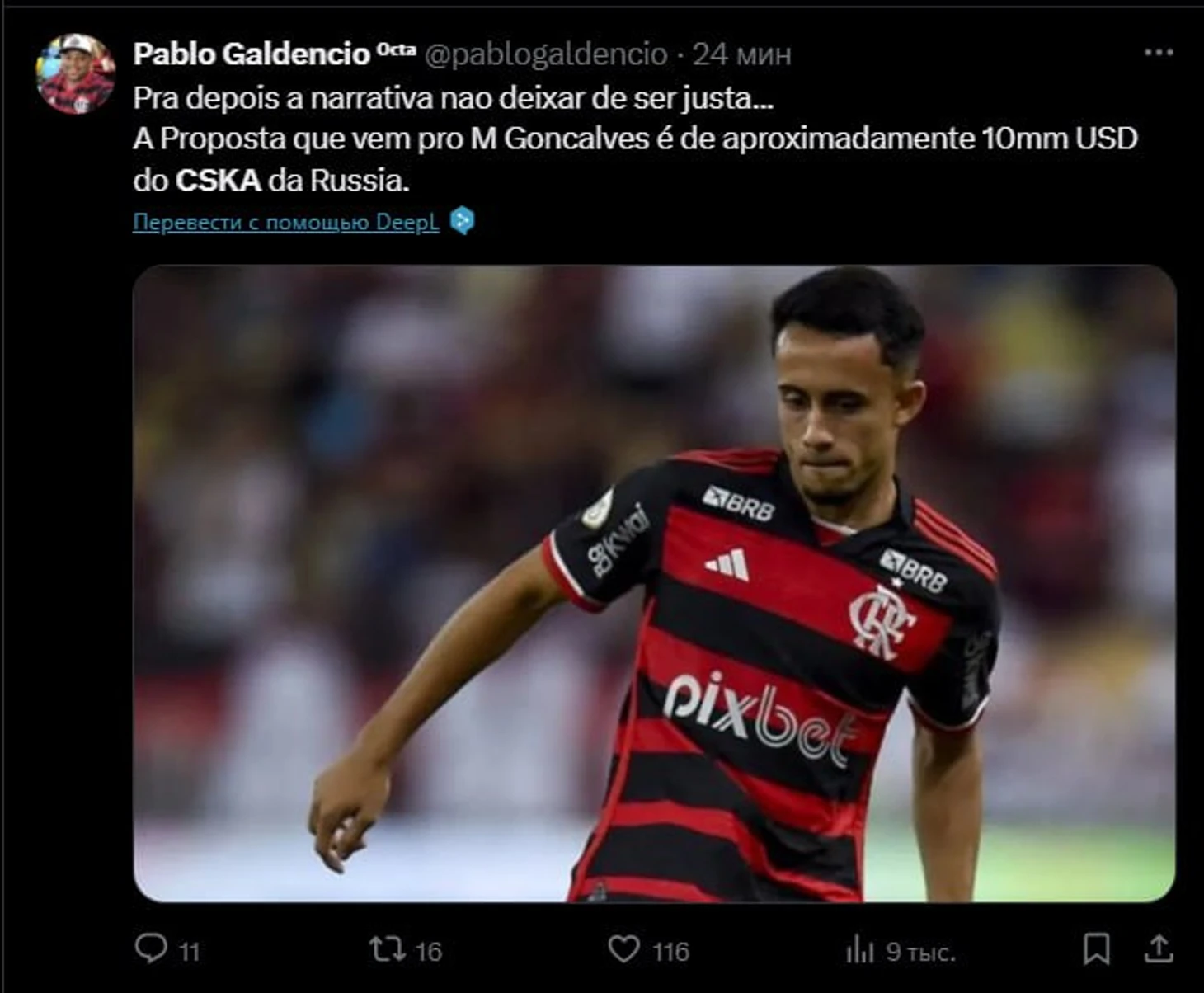 Также на 19-летнего крайнего нападающего претендует Крузейро — конкурент Фламенго за чемпионство в Серии А (разница между ними всего один балл). У них красно-черные запросили за своего воспитанника 8 млн евро.