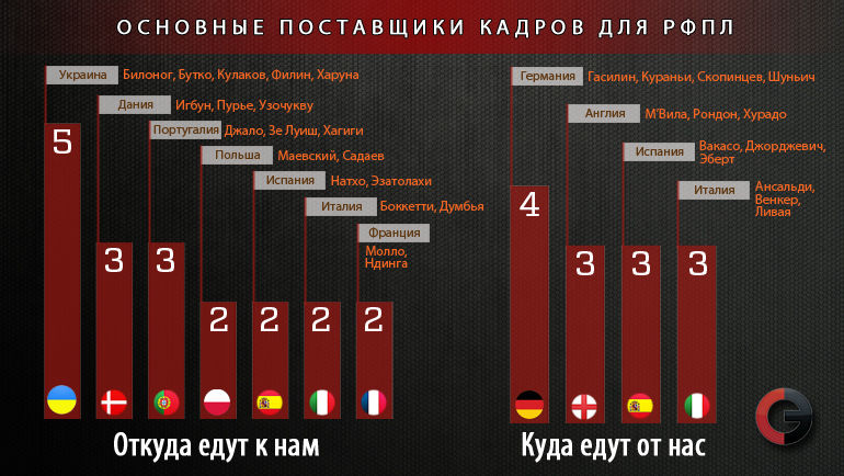 4. Продолжился отток легионеров. Здесь дело не только в лимите, но и в ухудшении финансовой ситуации, и в общем ощущении от нашего чемпионата, а также в стремлении клубов к избавлению от иностранцев (особенно от тех, кого нельзя назвать незаменимыми). Третий год кряду РФПЛ несет ощутимые потери. На этот раз – Вальбуэна, Кураньи, Рондон, Дуглас, Хурадо, Джуджак, Чельстрем, Тимощук, Шуньич, Аилтон и многие другие. Вновь общий уровень "экспортированных футболистов" оказался выше "импортированных", что вряд ли в лучшую сторону отразится на уровне всего чемпионата.