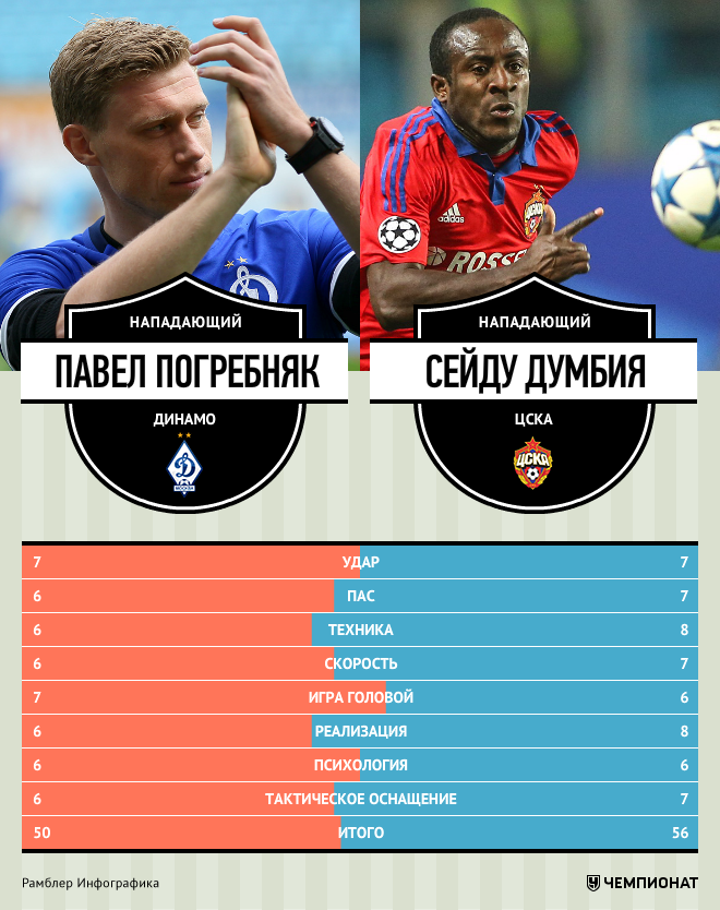Сравнение Думбия и Погребняка вполне уместно, так как оба играют на острие атаки, при этом обладая абсолютно разными качествами. Сейду более ловкий, маневренный и гибкий. Павел – более пробивной, мощный и, как говорил Гус Хиддинк, давая задания форварду в сборной России, способный «делать поле длиннее». Более того, Думбия и Погребняк входят в число тех игроков, которые вернулись в чемпионат России из Европы. Сейду сделал это после краткосрочного отъезда. У Павла же командировка в Германии и Англии затянулась, так что неудивительно, почему ему пока приходится сложнее. Плюс не стоит забывать о реструктуризации, которая произошла в «Динамо» и по кадрам, и по целям, и по восприятию клуба в целом. Это Думбия в ЦСКА как влитой, у Погребняка ситуация иная.