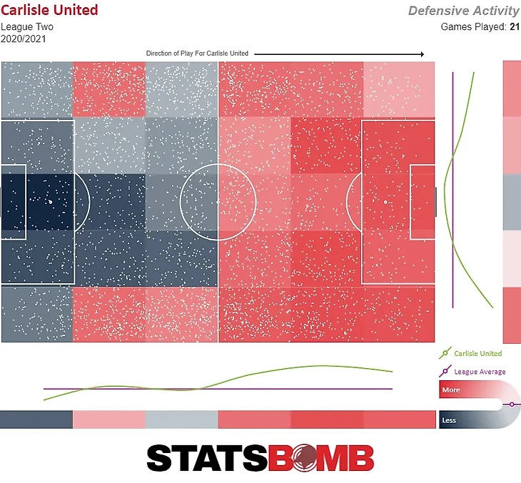 В прошлом сезоне Карлайл в основном защищался на своей половине поля, но в этом сезоне они активны и гораздо выше в поле: их оборонительная дистанция- среднее расстояние от собственных ворот команды до зоны выполнения оборонительного действия, - сместилась с 41,2 метра, 23-е место в сезоне 19/20, до 47,4 метров, 1-е место в сезоне 20/21. Это отлично работает - Карлайл допускает меньше всего ударов в лиге.