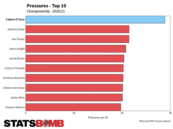 Это неудивительно, учитывая, что О’Хара лидировал в Лиге 1 и в прошлом сезоне с колоссальным показателем в 33 попытки прессинга соперника на 90 минут. Это число немного ниже в этой кампании - понятно, особенно учитывая плотный график, - но сравнительно с Championship это едва заметно. Результатом стало, что никто во всей EFL не оказывал большего количества попыток давления за 90 минут чем О'Хара, и даже в Championship нет даже никого близко.