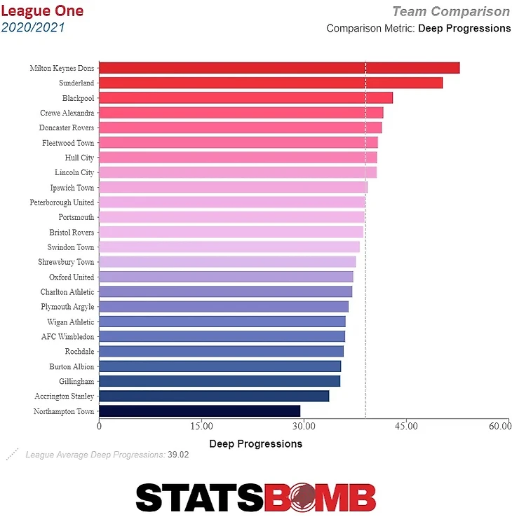 Полная зеркальность процесса и результатов на стадионе MK. Команда из Милтона Кейнса с показателем 52,8 продвижений из глубины на 90 минут, выводит их последнюю треть соперника чаще, чем любую другую команду в первой лиге, и, оказавшись там, они также выполняют больше передач в пределах 20 м от ворот, чем любая другая команда, совершая 6,4 доставки мяча из глубины (исключая передачи верхом) за 90 мин. Однако это превосходство не превращается в удары или хорошие голевые моменты: Dons занимают 13-е место в Первой лиге как по ударам, так и по ожидаемым голам.