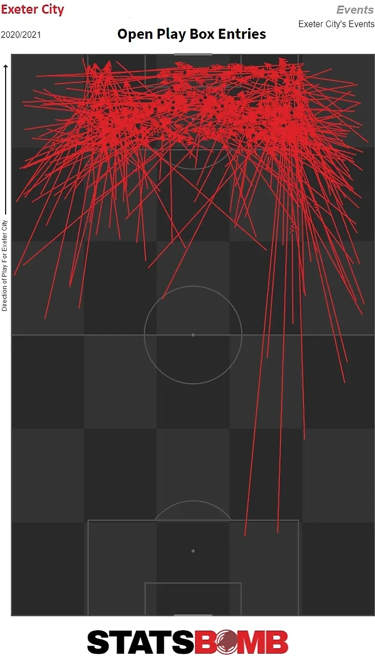 Учитывая соревновательный баланс во второй лиге, очень приятно видеть, как команда показывает цифры такого масштаба, особенно ту, которая в настоящее время находится на 9-м месте в таблице. Клуб из Девона внедрил новый стиль игры под руководством менеджера Мэтта Тейлора, который предпочитает, чтобы они стремились входить в штрафную высоко-значимых зон, а не играть в нее из более глубоких позиций. Почти все их входы в штрафную площадь приходятся на владение мячом в последней трети поля.