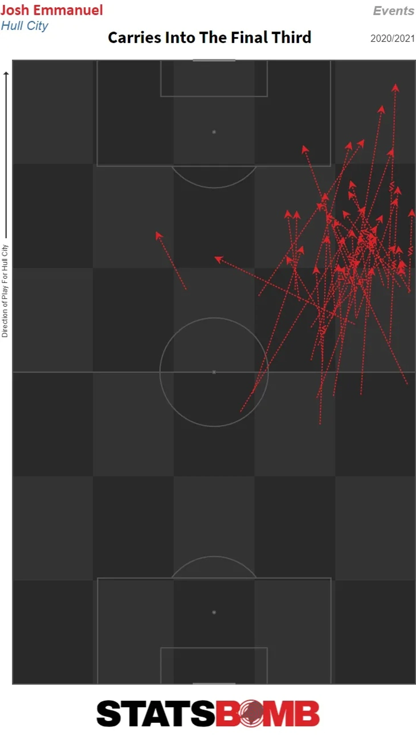 Он не ограничивается простым продвижением мяча, он также способен эффективно обыграть соперника 1в1. Эммануэль совершил наибольшее количество обводок среди защитников первой лиги в этом сезоне и уступил лишь двум другим в сезоне 2019/20. Эта способность игры на мяче означает, что он выполняет длинные передачи менее трех раз за игру, несмотря на то, что более половины его передач выполняются под давлением, и он также был ключевым игроком в атакующей стадии игры Халла: занимая второе место по врываниям в финальную треть в своей команде, и третье место по количеству пасов в штрафную и имеет третий по величине xG ассиста с игры.