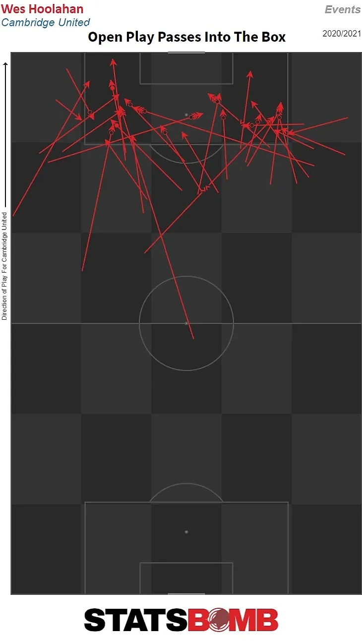 Юнайтед, которые на момент написания статьи были лучшими в лиге, гораздо более склонны к вертикальному продвижению через центр поля, и забеги Хулахана и последующие проникающие передачи стали обычным явлением на стадионе Abbey. Даже в 38 лет класс и качество, которые позволили ему сыграть более чем в 100 матчах в Премьер-лиге за Норвич, по-прежнему очевидны и являются важным преимуществом в атакующей игре Кембриджа. Вы можете отличить фирменные проходы Хулахана через бреши в обороне соперника, глядя на его передачи в штрафную с игры.