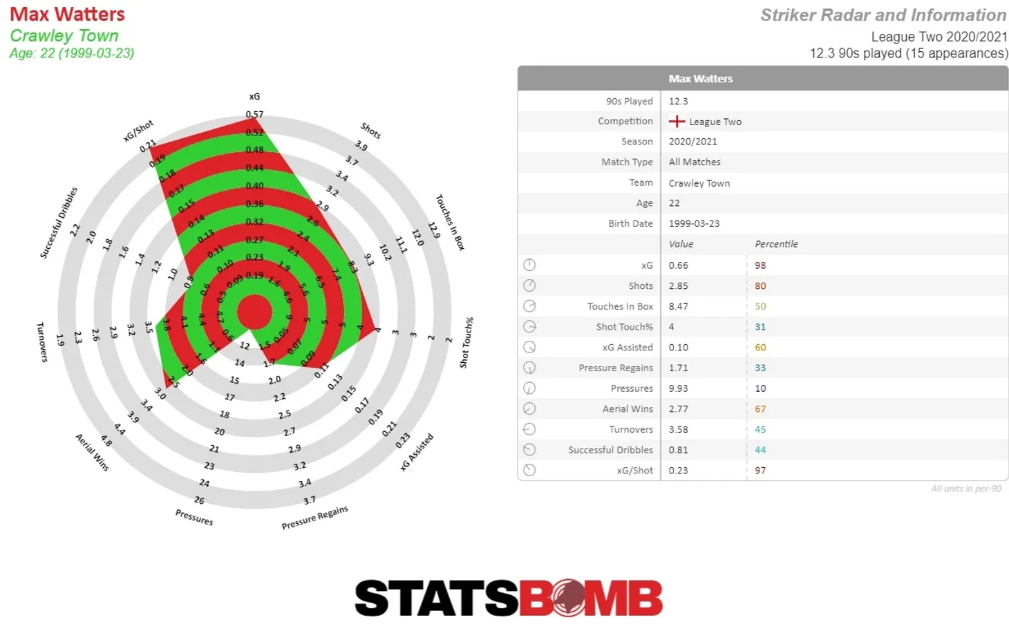 Уоттерс был на шаг впереди своих ожидаемых голов, забив свои 13 голов при 8.1xG, но он неоднократно демонстрировал свою интуицию, чтобы занять хорошие голевые позиции и завершать моменты разными способами - забивая левой, правой или головой - с минимальными потерями при выборе удара. Его показатель 1,06 гола на 90 минут был настолько высоким, что он был почти на пол-гола лучше, чем следующий лучший результат во второй лиге, а его 0,66 xG за 90 минут также с явным преимуществом впереди остальных.