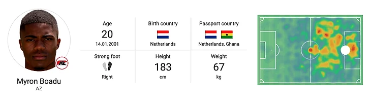 Несмотря на это, играя под номером девять, Боаду часто перемещается по обоим флангам, чтобы внести свой вклад в развитие игры, что свидетельствует о том, что он, помимо того, что является одним из самых талантливых игроков, также готов взять на себя ответственность: он опускается, чтобы прикрыть позицию де Вита, или смещается направо, чтобы сменить Кэлвина Стенгса, другого молодого таланта команды. Если и есть что-то постоянное в плавной и разнообразной игре АЗ, так это активная роль Боаду в построении игры, а не сосредоточение внимания только на поиске ворот. Его способность принимать решения на фланге на удивление зрелая для игрока его возраста, и когда он руководит действиями, он демонстрирует необходимую скорость и технику. Если бы мы что-то критиковали, мы бы выбрали отсутствие креативности.