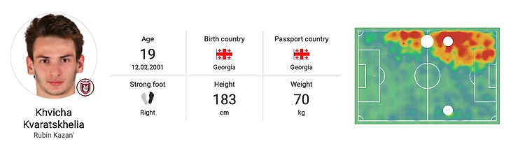 Кварацхелия, номинированный в прошлом году на MVP российской лиги и ставший лучшим игроком Грузии 2020 года, быстро становится одним из самых уважаемых игроков российско-кавказского футбола. Он буквально появился из ниоткуда во второй половине сезона 2018/2019, находясь в аренде в «Локомотиве» из грузинского «Рустави», и за несколько минут, проведенных на поле, никто особо его не заметил. По окончании сезона «Локомотив» не смог договориться о продлении пребывания в столице - к большому гневу тренера команды, - что открыло двери для «Рубина» из Казани. Много времени не потребовалось, чтобы понять, что российская сторона заключила сделку.