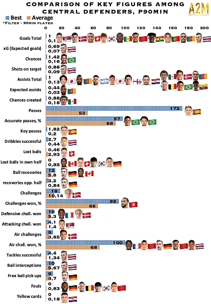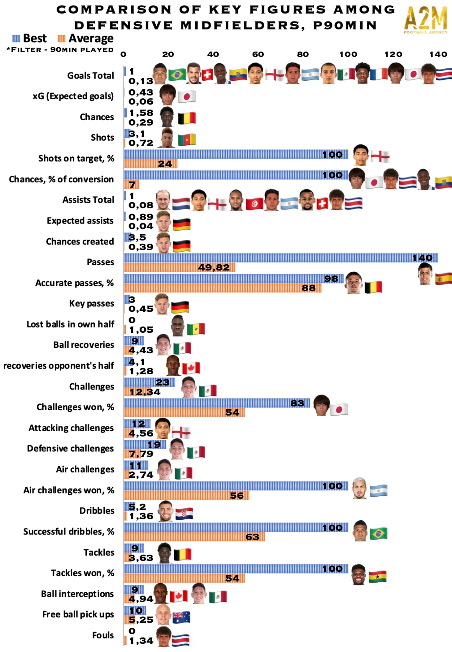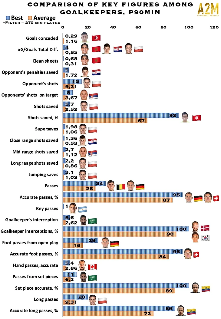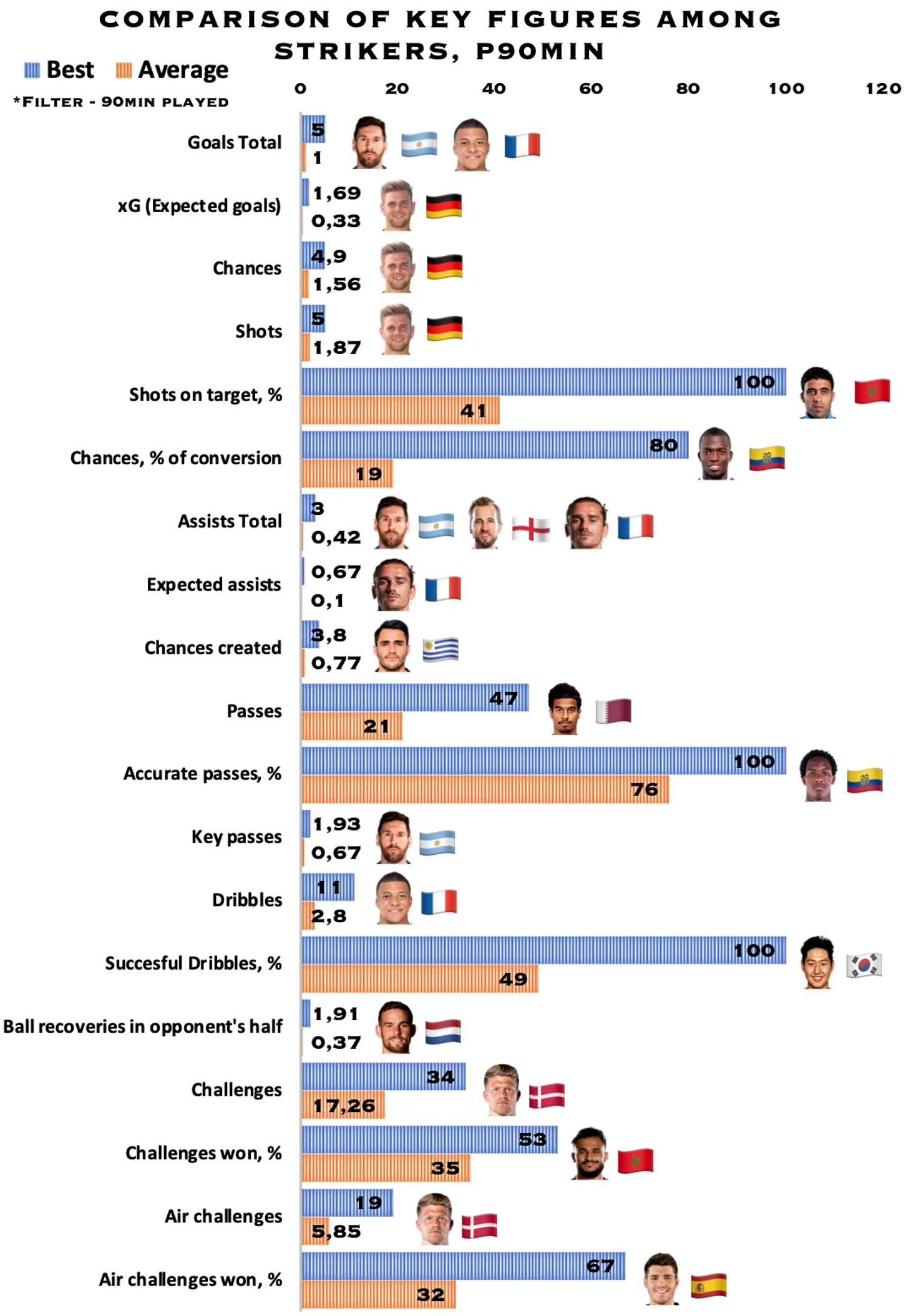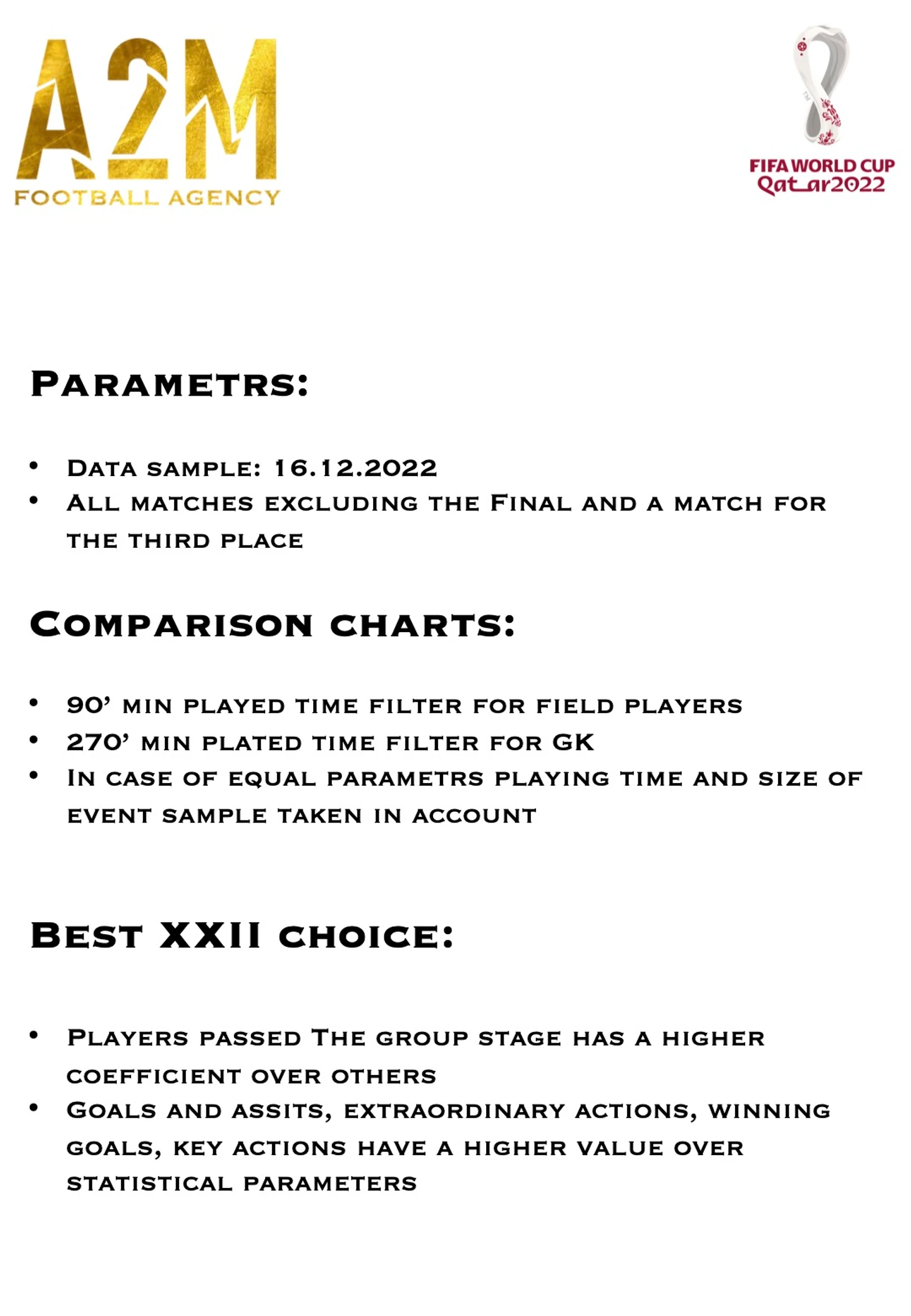 *Для полевых игроков использовался фильтр в 90 сыгранных минут, так как чемпионат мира достаточно короткий турнир и при большем фильтре мы теряем большой срез игроков, которые не прошли групповую стадию.