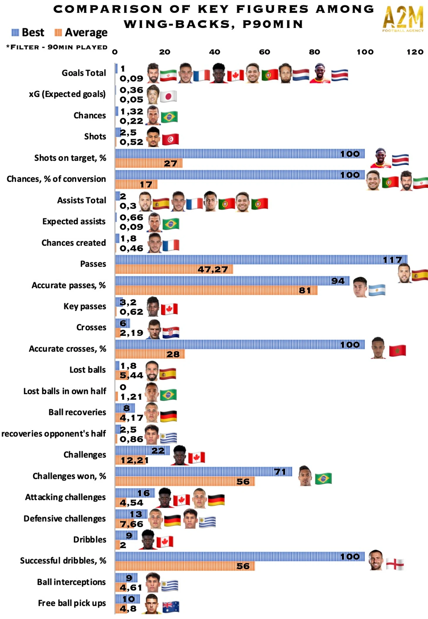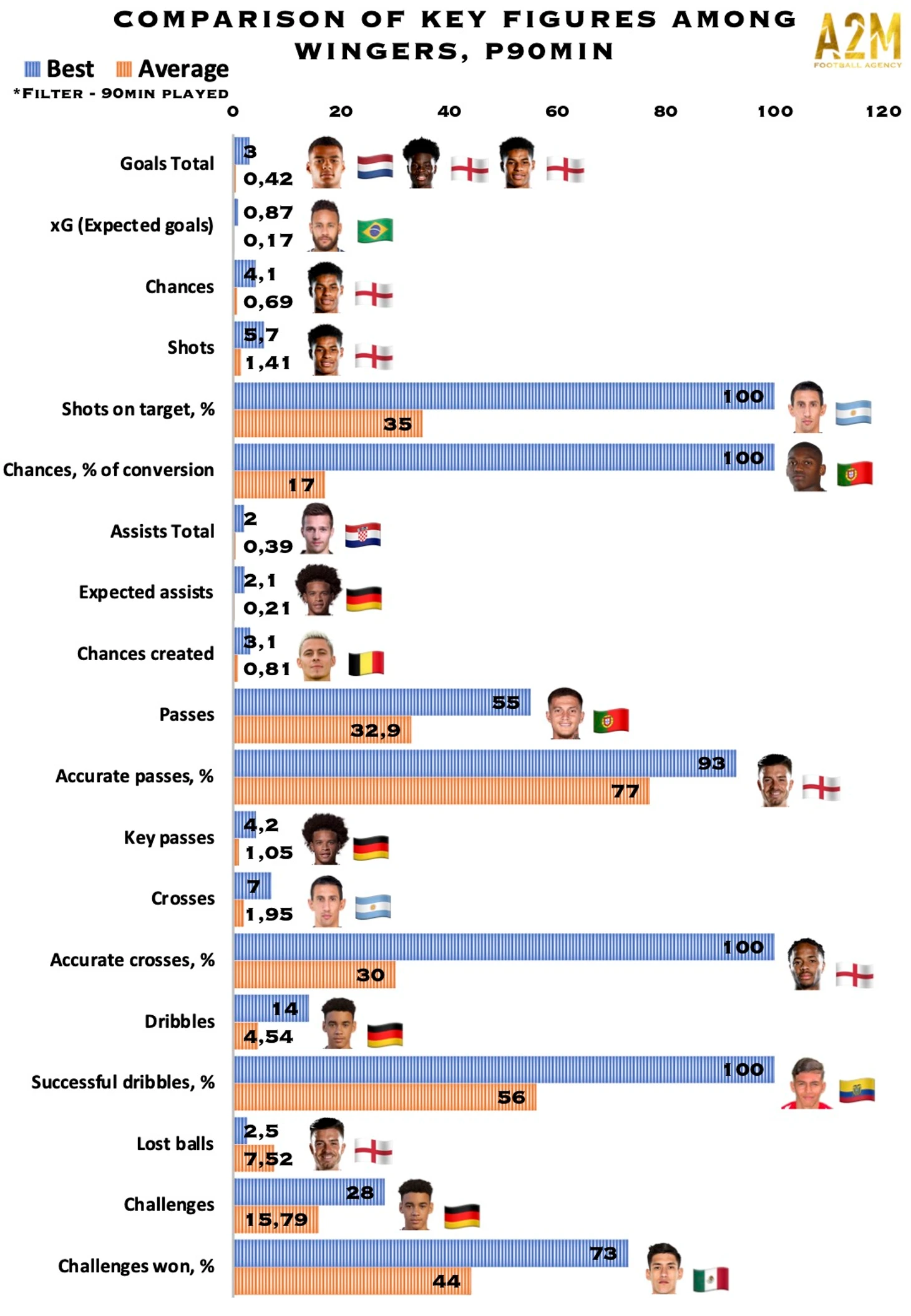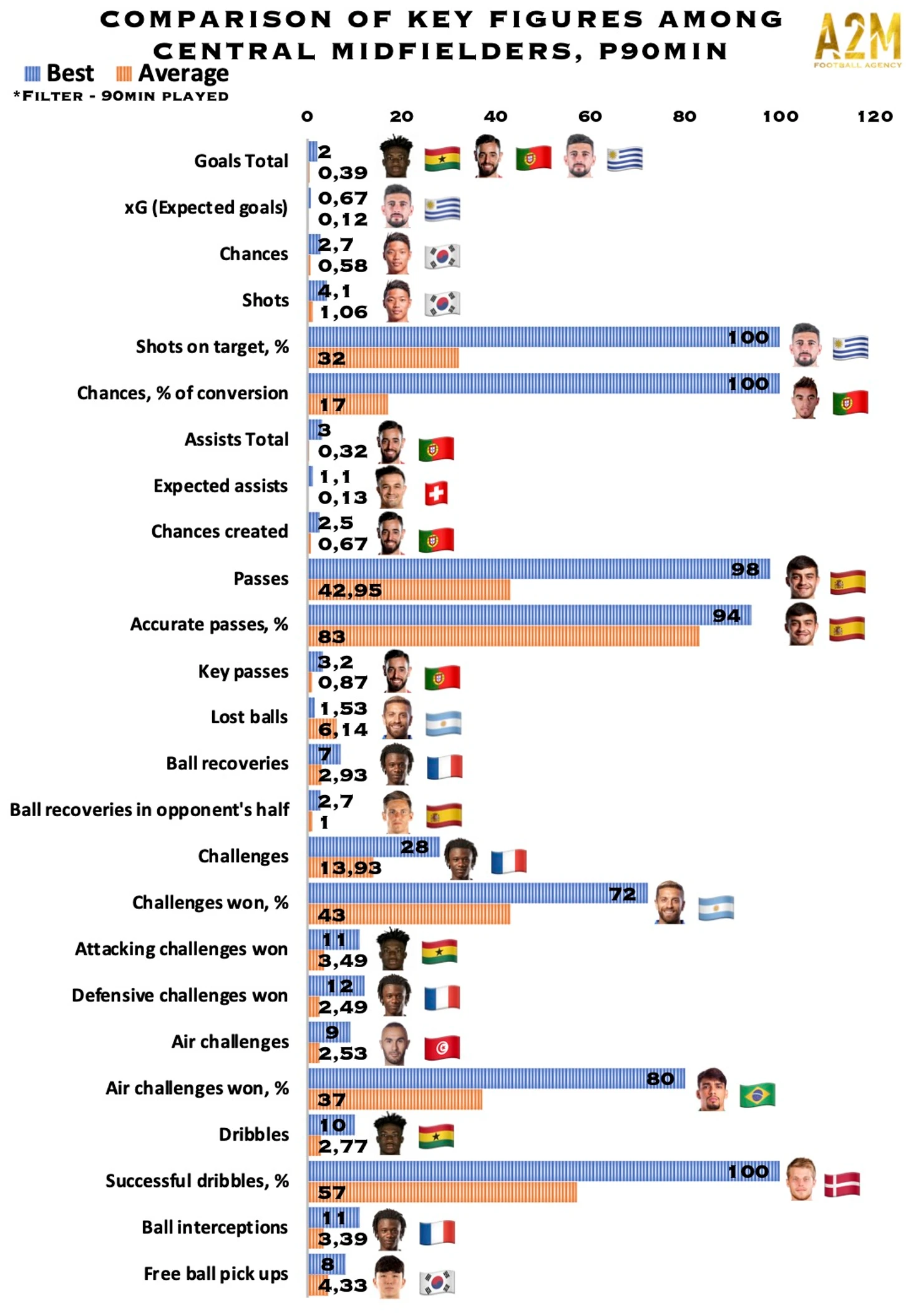 Занимательная инфографика: 22 лучших, сборная u21, сравнительные чарты ключевых показателей по позициям. Выбор футбольного агентства A2M