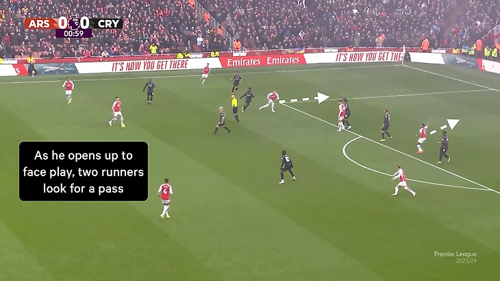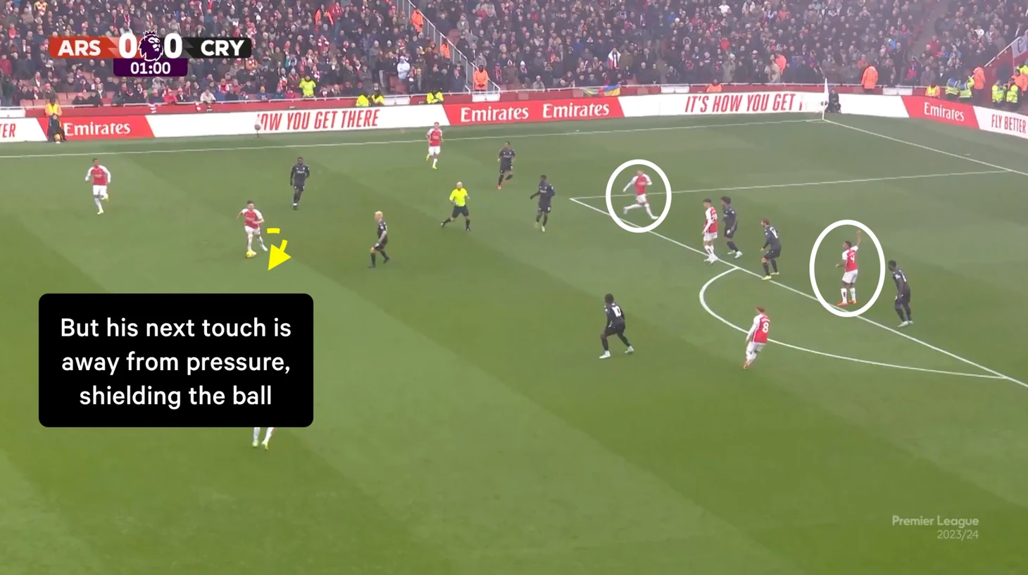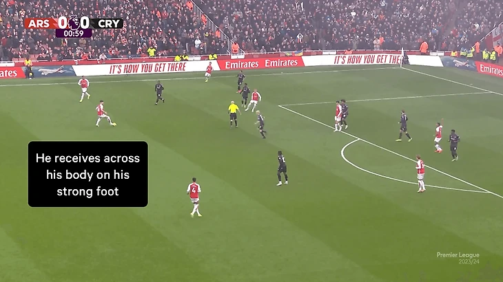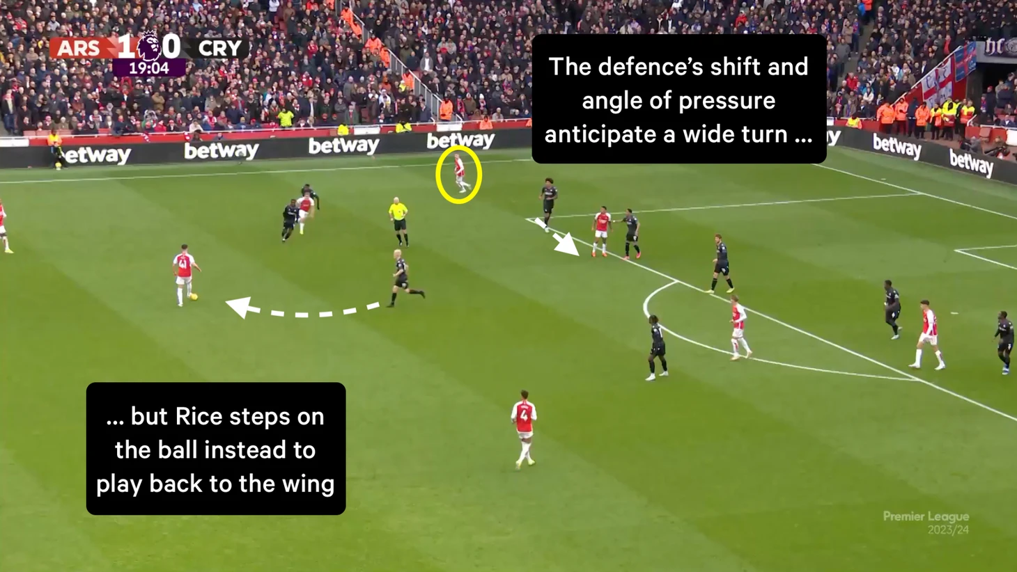 В приведенном ниже примере Райс считывает смещение защиты «Кристал Пэлас» и угол давления Уилла Хьюза и решает принять мяч на подошву и отправить его обратно влево, а не принимать его через корпус: