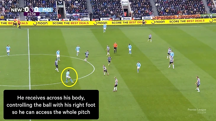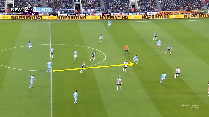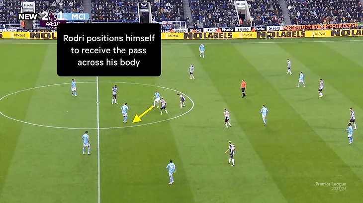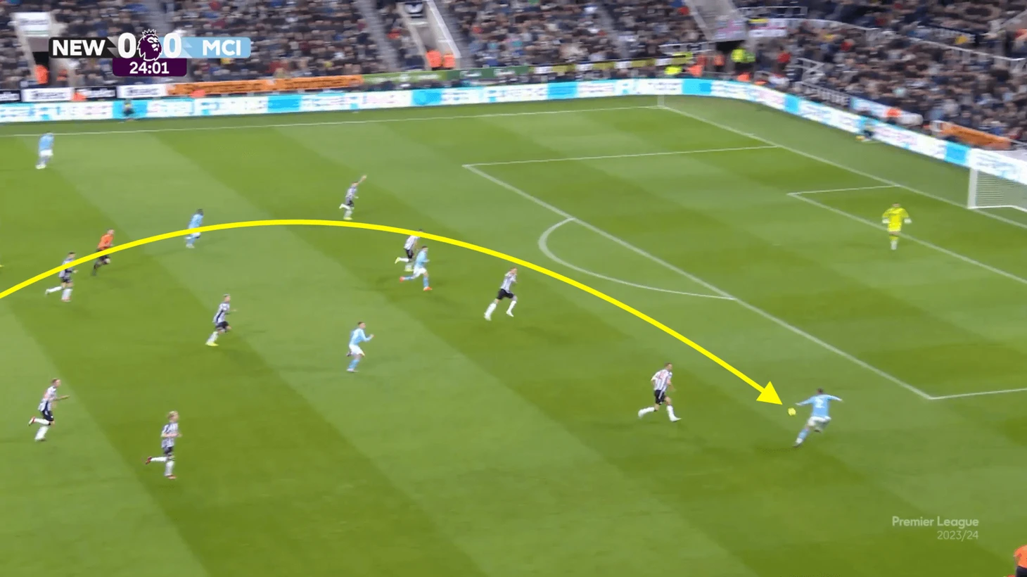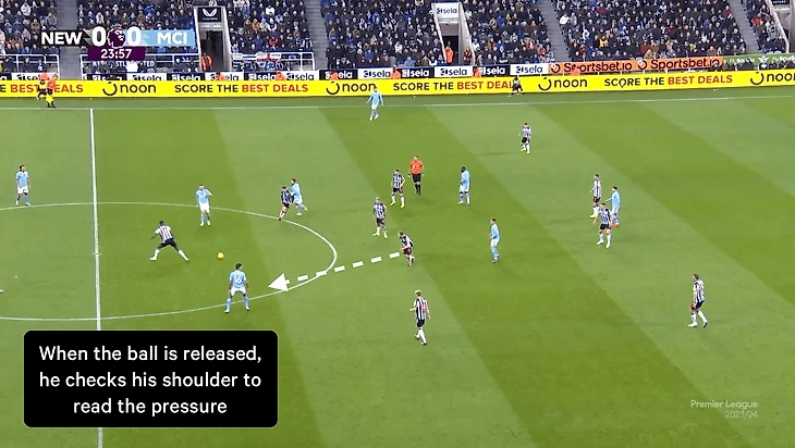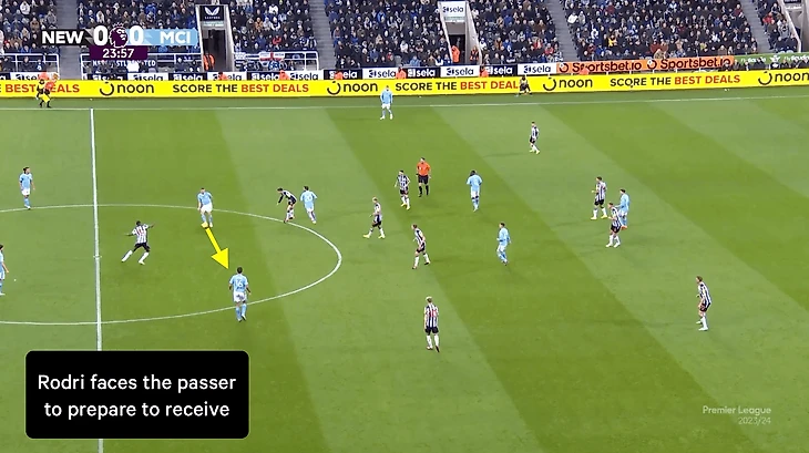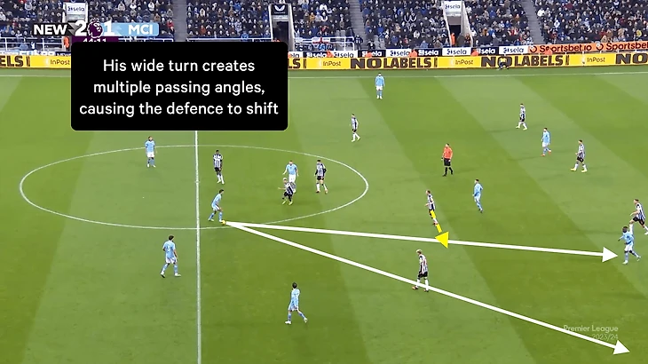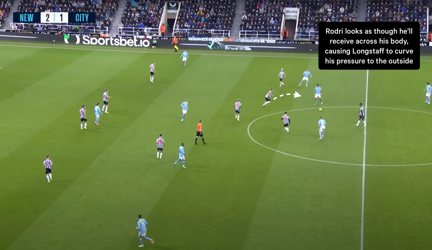 Если бы Родри не принял мяч под дальнюю ногу и с открытым корпусом, давление Бруно Гимарайнша перекрыло бы этот коридор, а Шон Лонгстафф смог бы остаться достаточно узко, чтобы сыграть на перехвате. Ориентация тела Родри предполагает, что он может попытаться отдать более широкую передачу Уокеру на фланг или Джереми Доку в центре, тем самым открыв проход для Фодена в центре.