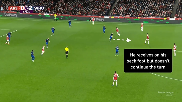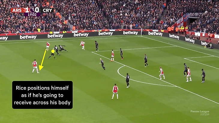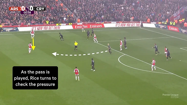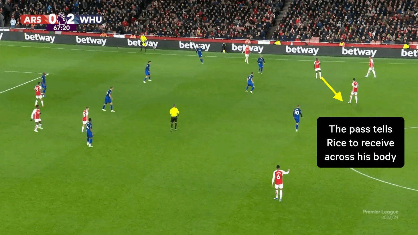Сравните это с игрой полузащитника «Арсенала» Райса, который также получает короткий поперечный пас, как показано в примере ниже, но с незначительными отличиями…