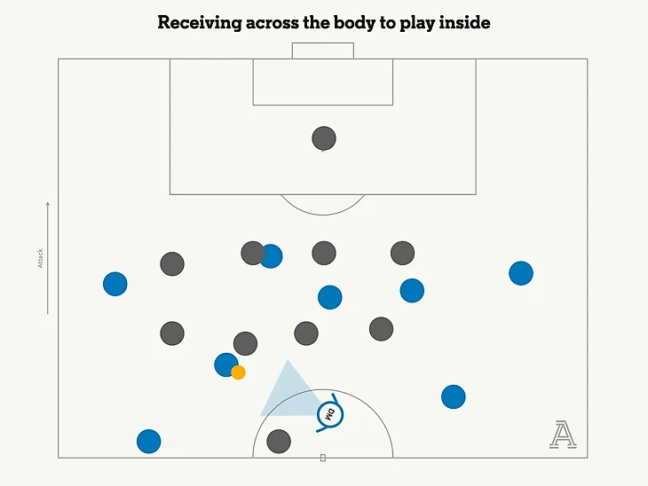Нет никакого секрета в том, что здесь делает Родри. Это футбольные «2+2». Но даже малейшие нюансы того, как игрок принимает мяч, могут иметь большое значение на то, что произойдет дальше.