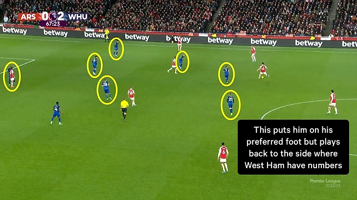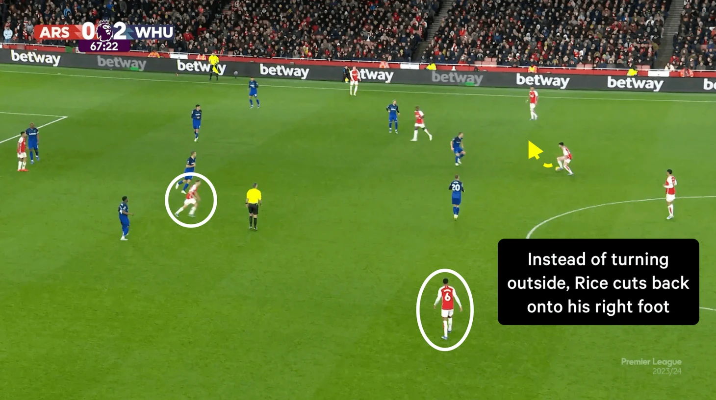 Райс и Родри правши, но Райсу менее комфортно двигаться справа налево, где для передачи вперед ему может потребоваться использовать левую ногу или внешнюю часть правой. Когда мяч летит справа от него, вы часто увидите, как Райс отправляет его обратную сторону, а не принимает через корпус под дальнюю. Даже когда он раскрывается, чтобы контролировать мяч левой ногой, его следующим касанием может стать смена направления, чтобы вернуть мяч на свою любимую правую.