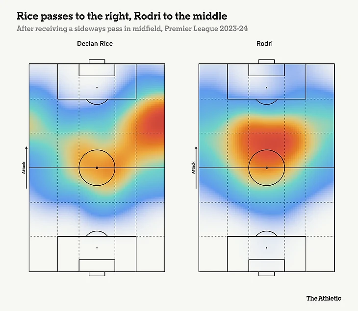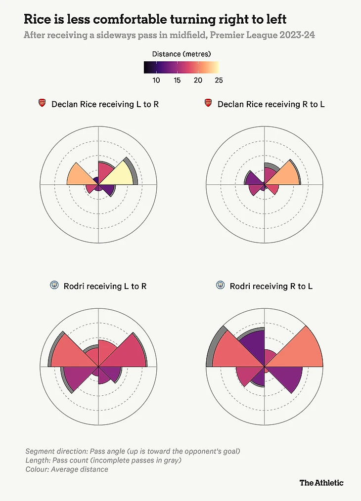 Когда они принимают мяч слева, оба игрока с одинаковой вероятностью направят следующий пас влево или вправо, но когда они принимают мяч справа, прием в дальнюю будет означать, что мяч придет на более слабую левую ногу. Родри остается универсальным и непредсказуемым, а Райс с гораздо большей вероятностью отдаст пас вправо, чтобы избежать неудобного разворота.