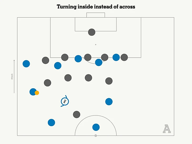 Разница между отличным разворотом и не очень может сводиться к внутреннему комфорту. Каждый игрок знает преимущества приема мяча в пол-оборота — лучший контроль, более широкие углы, больше вариантов — но решит ли игрок сделать это под давлением, зависит от того, что, он посчитает, может ему сойти с рук в данных обстоятельствах. Речь идет об индивидуальных способностях и готовности рисковать.
