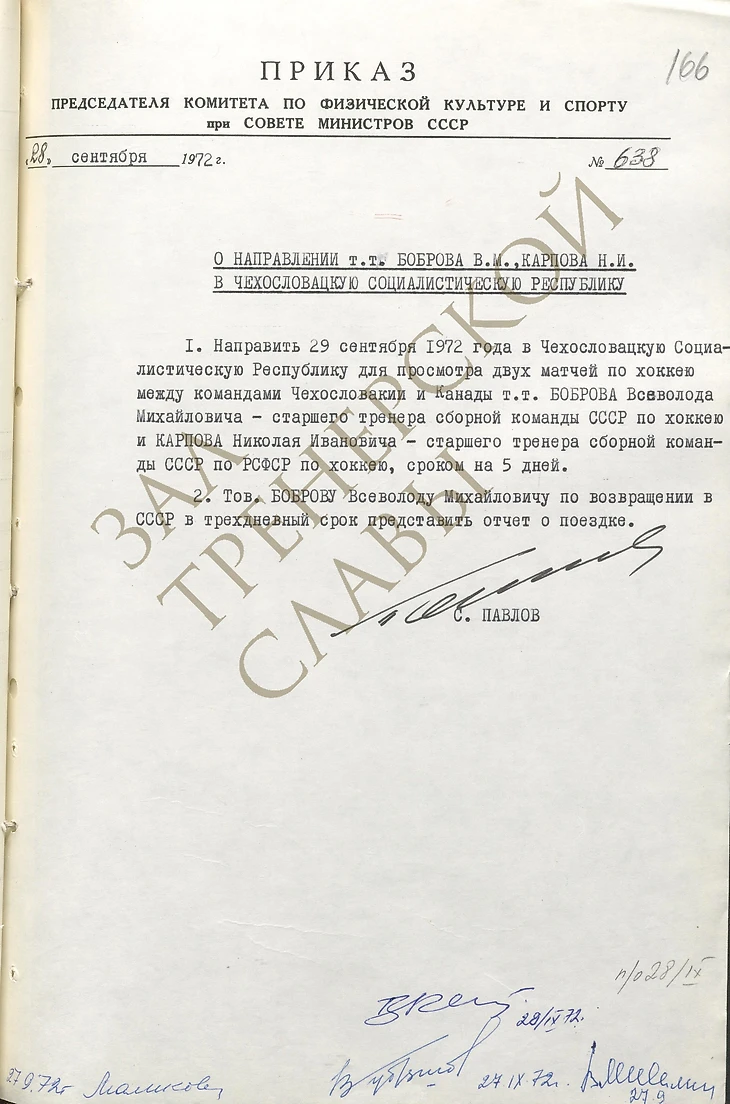 2. Буквально на следующий день после заключительного, восьмого матча Суперсерии (четвёртого в Москве) – 29 сентября – старший тренер Всеволод Бобров и «старший тренер сборной СССР по РСФСР» Николай Карпов вылетели на пять дней в Чехословацкую Социалистическую Республику «для просмотра двух матчей между командами Чехословакии и Канады» (скан #3). Что интересно, в «Вики» (и других источниках) числится только один матч ЧССР – Канада: 29 сентября, 3:3. Второй матч был запланирован, но не состоялся? Или это «очепятка» в приказе? Вряд ли намеренный обман…
