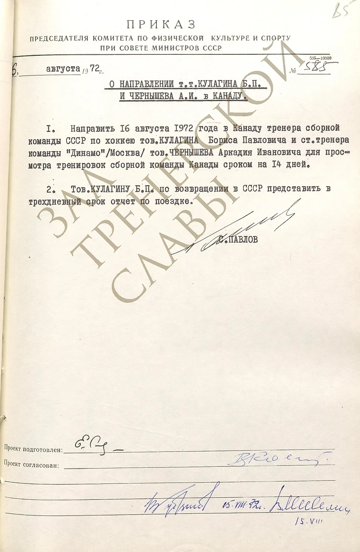 В общем, общеизвестно, что перед Суперсерией наши тренеры (Борис Кулагин и Аркадий Чернышёв) посетили сборы команды Канады, а канадские специалисты (Джон Маклеллан и Боб Дэвидсон) – наблюдали за подготовкой сборной СССР. Приказ о командировании Кулагина и Чернышёва в Канаду (с 16 августа на 14 дней) – в первом скане. Но что интересно и вопросительно вокруг этого…