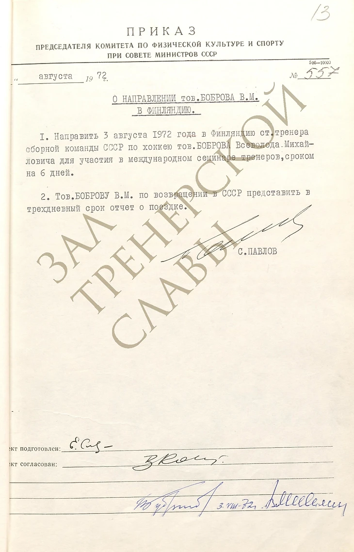 1. В «Вики» написано, что «советские хоккеисты начали упорные тренировки с 1 июля». Тогда получается, что в самый разгар подготовки – 3 августа – старший тренер сборной СССР Всеволод Бобров отбыл на шесть дней в Финляндию «для участия в международном семинаре тренеров» (скан #2). С учётом опубликованного ранее приказа о командировании сборной СССР на матчи в Канаду, получается, что команду в отсутствие Боброва тренировал-готовил – именно Кулагин? Потому что никакой третий тренер в просмотренных в Госархиве документах не указан…