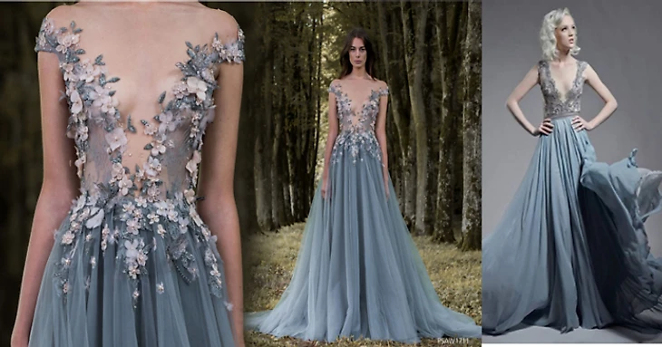 Костюмы Мэдисон и Захари для произвольного танца в первую очередь запомнились цветом. Казалось бы, как можно запомниться в серо-голубом…..оказалось можно. Цветовая гамма отлично вписалась в настроение танца, создав ощущение интимности и полушепота. Цвет ненавязчивый, благородный, не мышиный и Мэдисон идет. Незамысловатый фасон, но платье скроено под особенности фигуры. Иногда, главное - просто не перемудрить. И оттенок, и подобную легкую цветочную отделку можно было увидеть и на подиуме.
