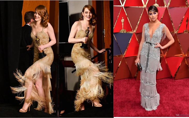 Эмма Стоун в золотом платье от Givenchy (как видим, в кинематографе золотое платье плохой приметой не считается) и Оливия Калпо в Marchesa:
