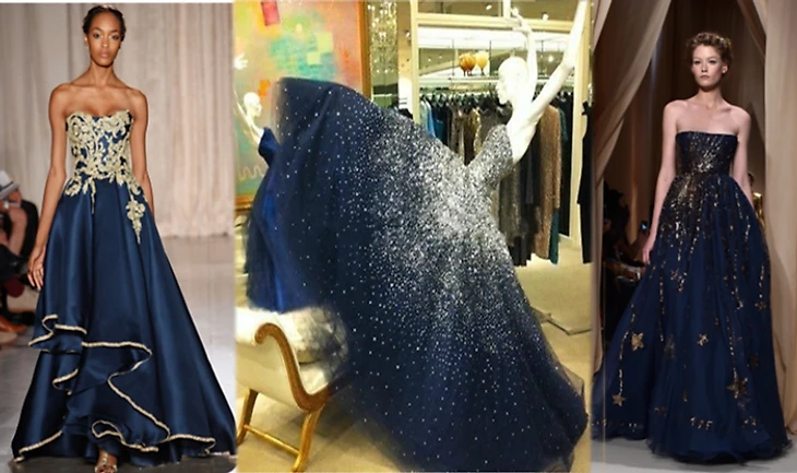 Сочетание темно-синего с золотым можно найти в платьях от Marchesa и Valentino (крайнее справа):