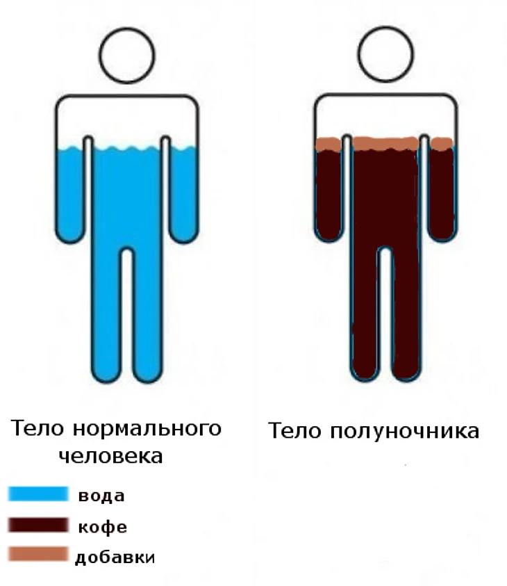 Тело нормального взрослого человека на 70% состоит из воды. Тело фигурнокатательного полуночника на 65% состоит из кофе и на 5% из добавок по вкусу. Молоко, сливки, вино, коньяк….корвалол…..валерьянка….
