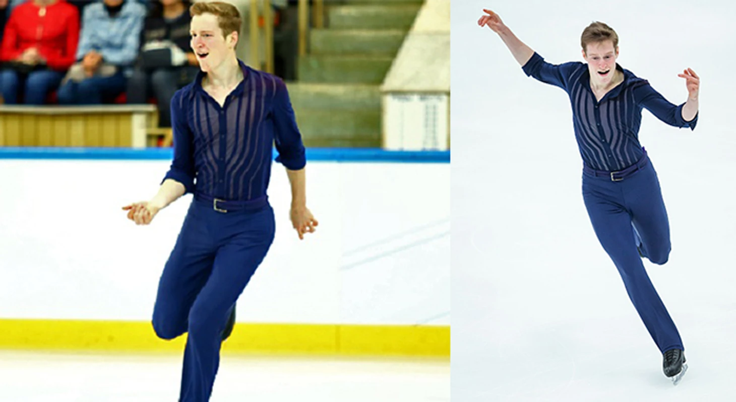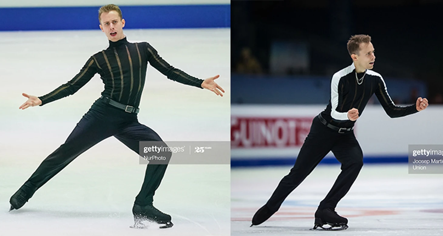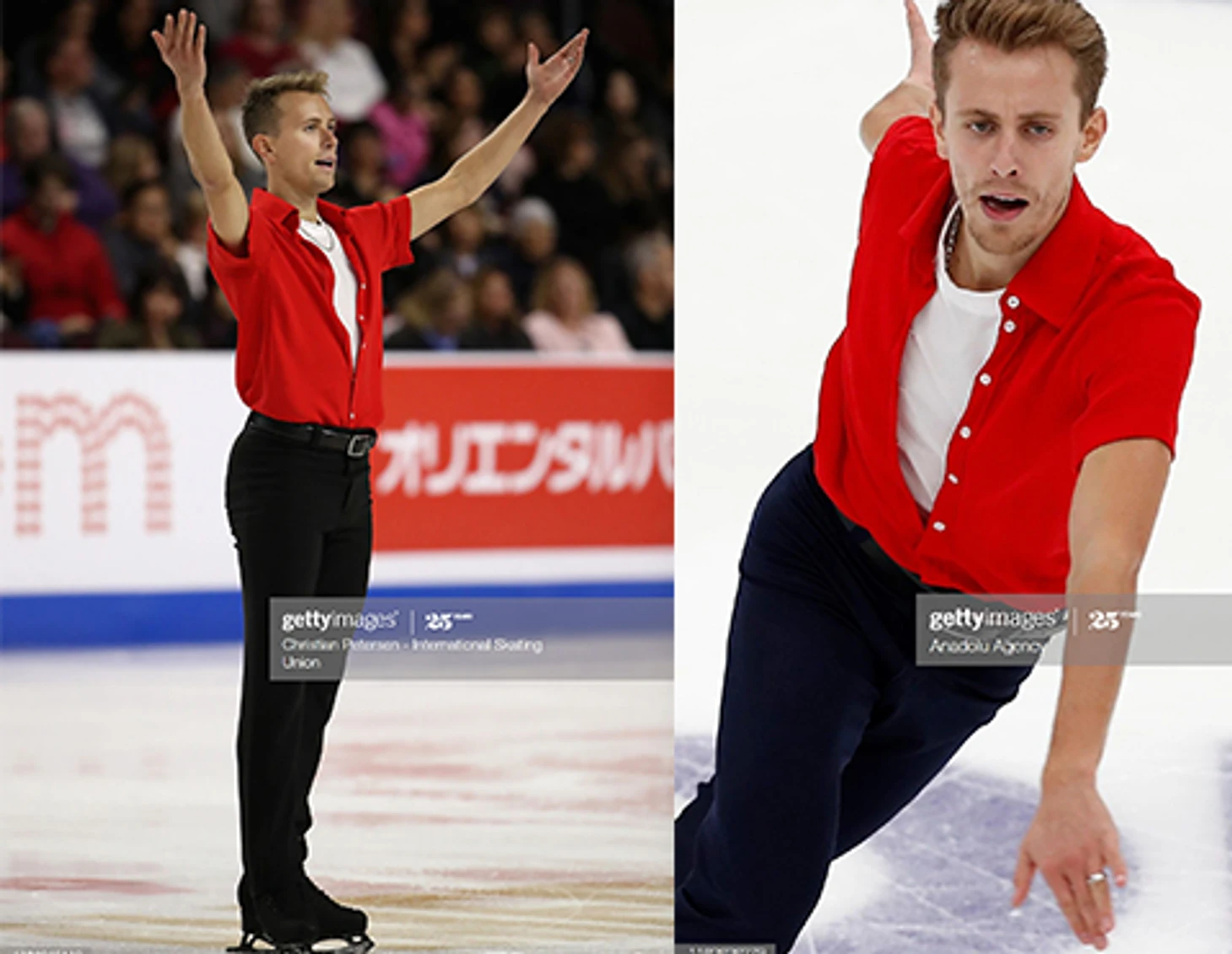 К национальному чемпионату Шома подумал и решил, что он не ежик отставать от трендов и тоже обзавелся рубашкой в оттенке года. Рубашка классная, идея с фигурными вырезами – манифик, посадка классических брюк просто улет – всем учиться. И все было бы шикарненько…Не наступи Шома на любимые грабли из шкафа фигуристок – коварную телесную сетку) *демонический смех*