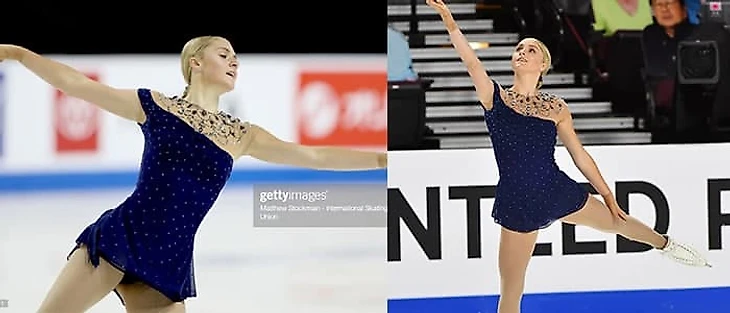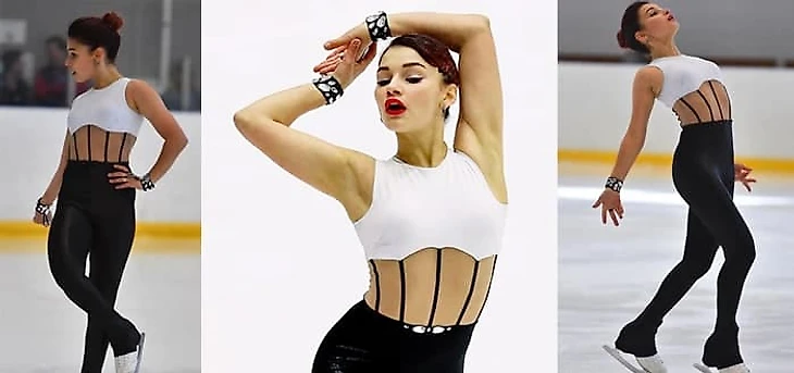 Лизон хотела быть современной, модерновой и не похожей на всех...Но что-то снова пошло не так. Этот наряд еще можно назвать оригинальным, но весьма трудно считать эээ комплиментарным. Загадка века, почему Лиза в жизни - яркая и стильная девушка, Лиза на льду - девушка в костюмах, которым хочется отказать в наличии вкуса.