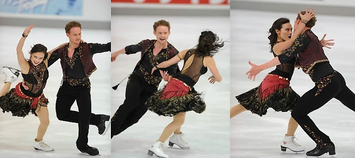 Костюм Гийома подчеркивает фигуру. И хоть эффекта жилок и вен на кофте нет, благодаря игре цветов костюмы партнера и партнерши не повторяют друг друга, но выполнены в одном стиле и концепции. Костюмы получились завораживающими усиливающими гипнотический эффект производимый их танцем. Что ж, французы, продвигают свое виденье на танцы на льду, то какими должны быть постановки, музыка, естественно, что и костюмы их должны были выделяться. Подобным минимализмом они как бы обособились от остальных, заставив навороченные, сложные костюмы смотреться на их фоне аляповато и неуместно. Были бы костюмы к кт поинтереснее – не задумываясь поставила бы на первое место.