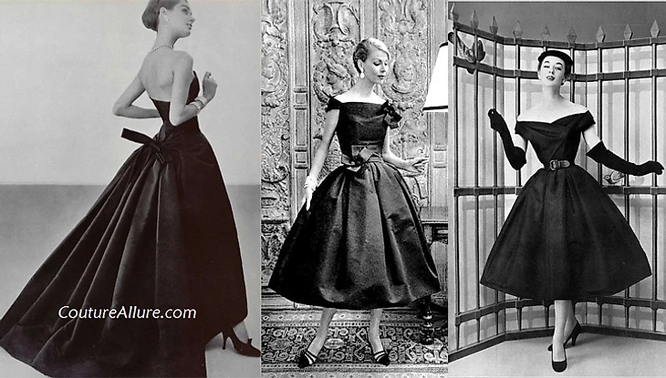 После Второй мировой войны женщины захотели вновь стать изящными, тем «слабым полом», которому нужно помогать садиться в такси и надевать пальто. Диор говорил: «Мы оставили за собой эпоху войны, форменной одежды, трудовой повинности для женщин с широкими плечами боксера. Я рисовал женщин, напоминающих цветы: покатые плечи, округлая линия груди, осиные талии и широкие, расходящиеся книзу, как чашечки цветка, юбки». Основным силуэтом платьев в стиле 50-х годов являются «песочные часы». Чтобы подчеркнуть идеальные формы женской фигуры, дизайнеры использовали прилегающие лифы. Линия юбки на талии опускалась на несколько сантиметров, что ещё более выделяло изгиб грудь – талия - бёдра и делала силуэт более хрупким. В качестве нижних юбок, для придания более пышной формы, использовались прозрачные материалы. Самыми распространенными узорами были горох, полоска и, конечно же, цветочный принт.