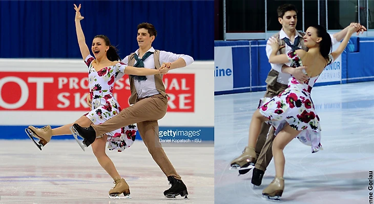 При всем разнообразии стилей, музык и тем, к которым обращаются фигуристы при постановке программ, жизнерадостные, женственные и немного легкомысленные платья встречаются не так часто. Обычно костюмы колеблются между "я так вижу себя на красной дорожке" и "ночнушки нынче в тренде". Поэтому я была очарована костюмами японского дуэта Эми Хираи - Мариен Де Ла Асунсьон и французов Лоренцы Алессандрини - Пьера Суке (точнее платьями девочек, так что простите, что именно женскому наряду я уделю больше внимания), все же цветочный принт не так часто встречается на льду. В обоих платьях прослеживаются нотки 50х.
