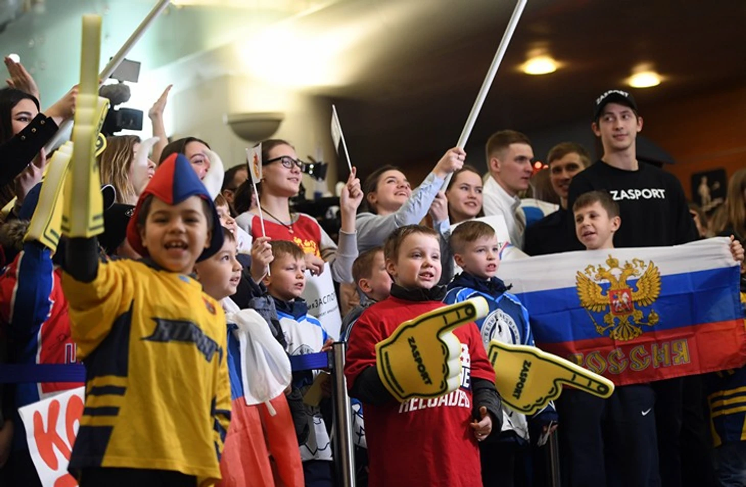 «Нас человек 20 из хоккейной школы «Центр». Здесь вместо тренировки, хотим посмотреть на сборную, – неуверенно шепчет 9-летний хоккеист Артем. Его команда в этот вечер очень популярна у репортеров.