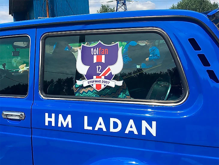Снаружи их «Нива» раскрашена под исландский флаг – синий цвет, красно-белая полоска, лого спонсоров и путешествия – HW Ladan. HW на исландском означает Кубок мира, буква N в окончании слова Lada – определенный артикль, как the в английском.