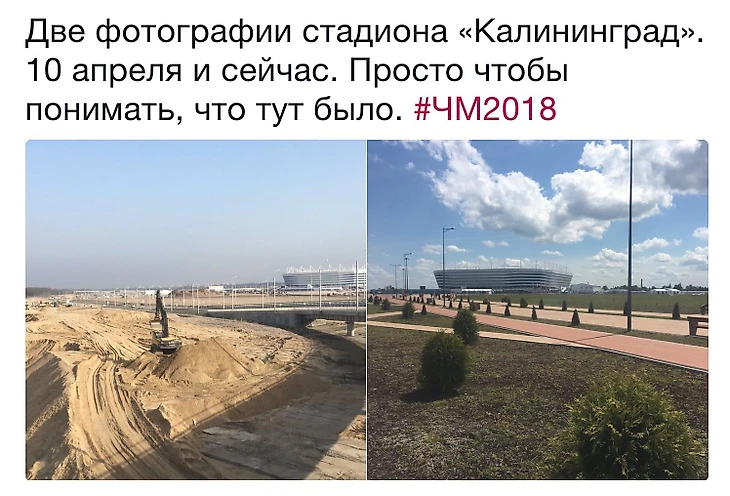 – В Калининграде ты похвалил стадион. А я много раз видел, как люди расшаривали два фото оттуда. Что было в апреле и июне. Все хвалили и восхищались.