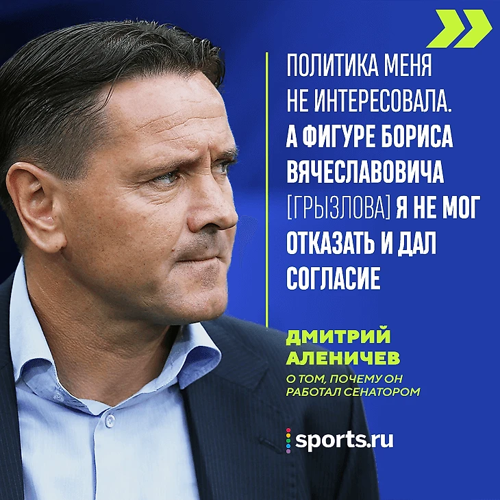 Гладилин говорит, что детали общения с Аленичевым он передал Грызлову. Тот ответил «Мы готовы взять его в политику» и назначил встречу самому Дмитрию. Уже в марте 2007-го бывший футболист избрался от партии власти в областной парламент родной Псковской области, где проработал всего три месяца. В июне Дмитрий стал сенатором – так называют всех членов Совета Федерации, где он присоединился к Гладилину, мини-футболисту Еременко, хоккеистам Третьяку и Фетисову, гандболисту Лаврову, борцу Карелину.