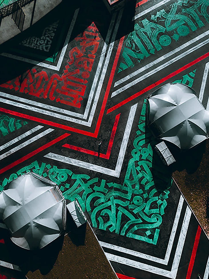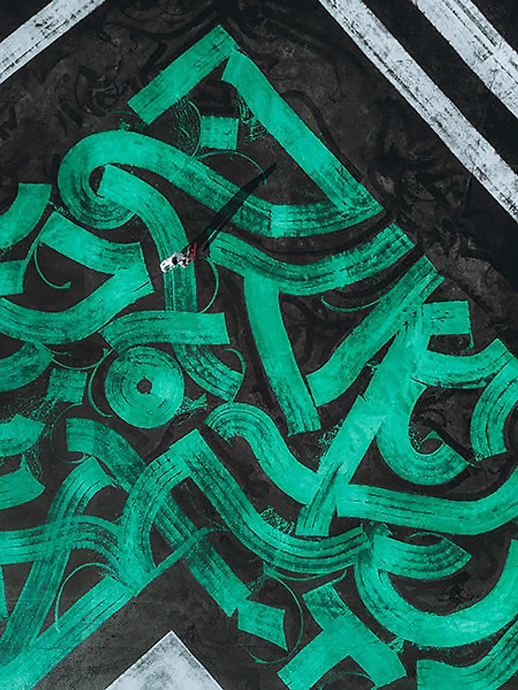 Многие буквы выглядят не как в классической каллиграфии – как говорит Покрас, этот ход символизирует развитие общества, когда границы стираются и в письме возникает мультикультурная гармония. Чтобы роспись стала чуть понятнее, Лампас дает подсказку: «Красный цвет – это зона кириллической каллиграфии, где написано по-русски. Зеленый – по-английски».