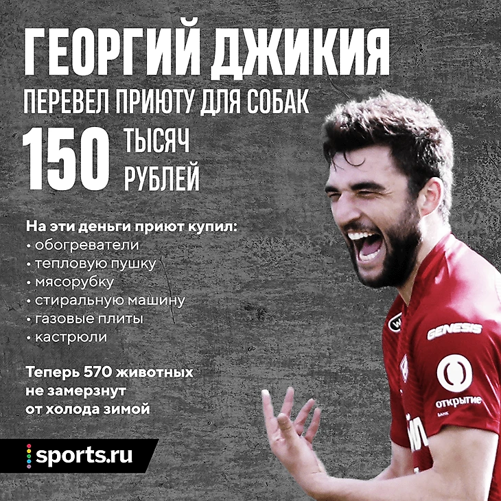 На прошлой неделе мы узнали о добром деле Георгия Джикия. Хозяйка приюта для собак «Ванечка» (это под Калугой) написала в инстаграме, что перед Новым годом игрок «Спартака» купил для животных газовую пушку, плиты для приготовления еды, стиральную машину, промышленную мясорубку и большие кастрюли.