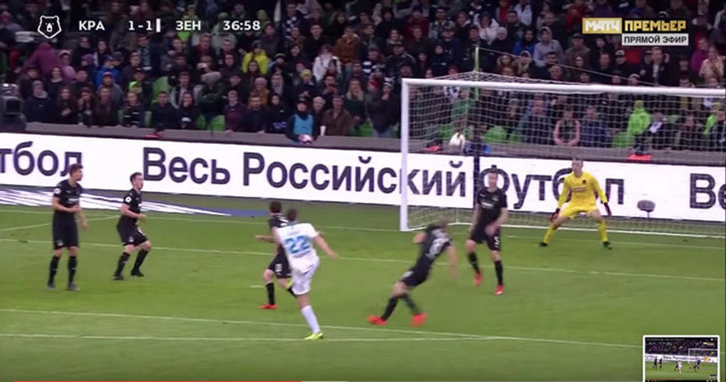 На 37-й минуте мяч отскочил на ногу Дзюбе у линии штрафной, ворота открыты, Сафонов пока не особо готов к удару.