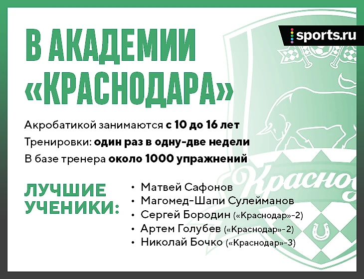 Акробатика в академии «Краснодара» – не то же самое, что в обычной акробатической секции. Некоторые упражнения для футболистов бессмысленны. Например, фляк назад (кувырок назад с ног: сначала приземление на руки, затем с рук снова на ноги – Sports.ru) – он может травмировать кисти рук. Или стойка на голове – акробатам ее выполнять легче из-за сильно развитых шейных позвонков, у непрофессионалов возникнут проблемы.