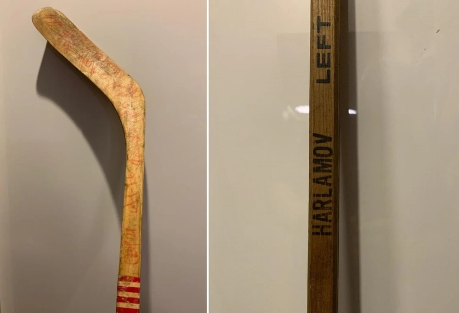 Некоторые клюшки – с большой историей. Вот та, которая пропала когда-то во время пожара в канадском посольстве. Клюшка канадского вратаря Кена Драйдена.