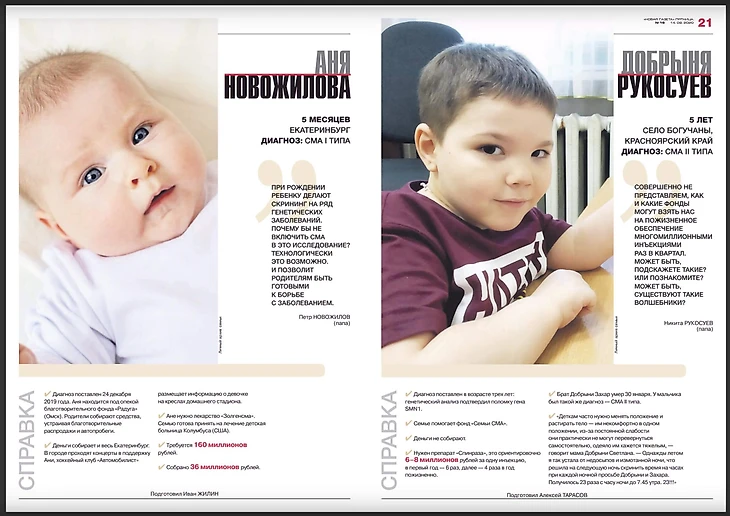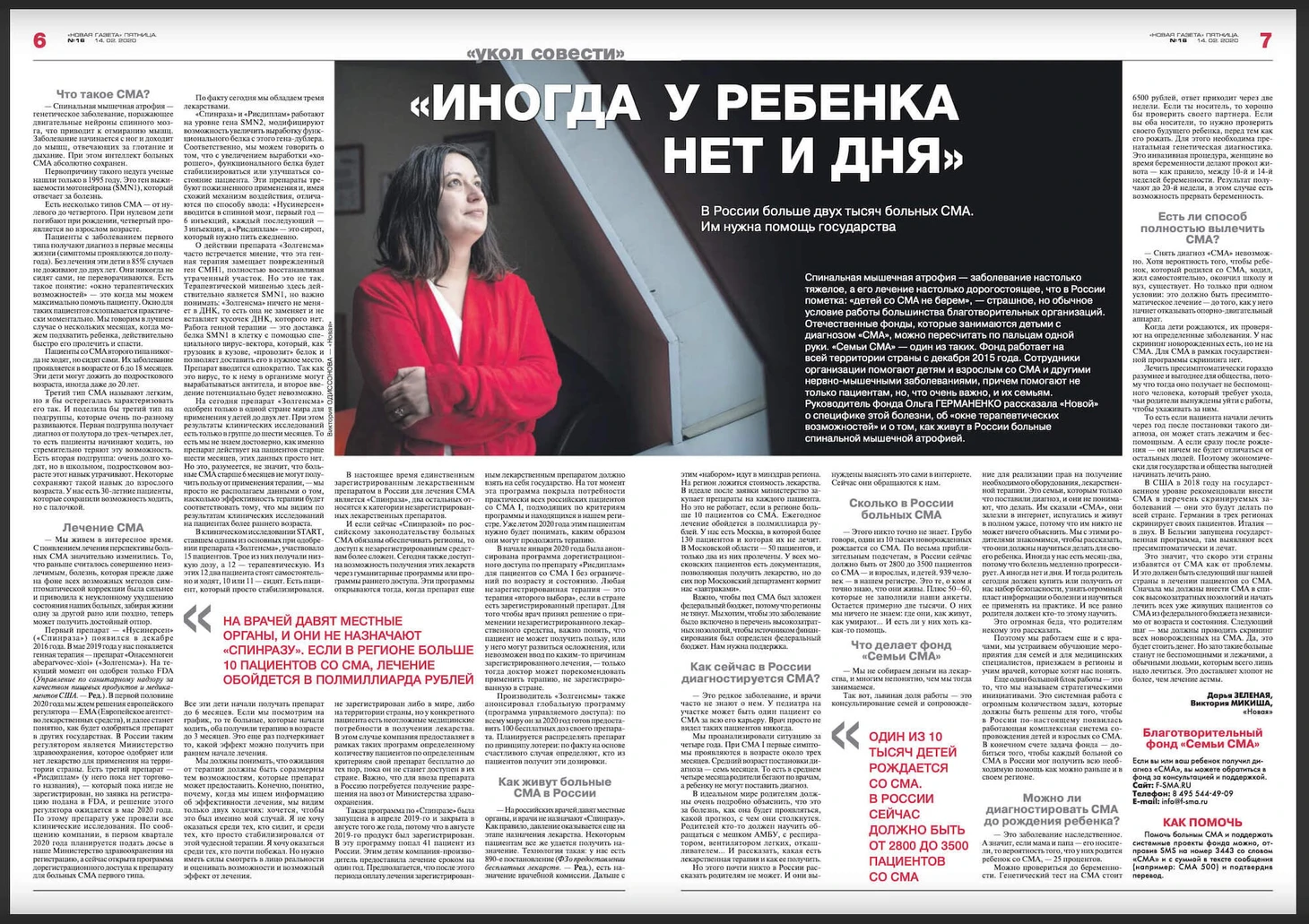 Последние несколько месяцев газета занялась темой СМА – спинальной мышечной атрофией, редкой и страшной болезни, которая убивает детей. Инъекция от нее стоит сотни миллионов рублей, а денег у государства нет. Чтобы помочь в сборе денег и придать ему публичности, главный редактор «Новой» выставил на аукцион клюшку Валерия Харламова из собственной коллекции. Ее почти сразу купили, а деньги на инъекцию нашлись уже следующим утром.