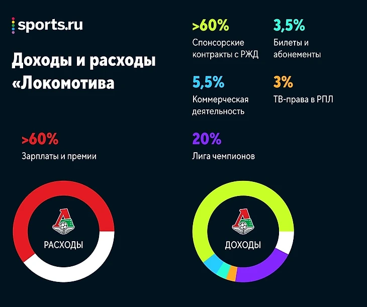 Зависимость «Локомотива» от РЖД – запредельна. Бывший гендиректор клуба Илья Геркус рассказывал «Чемпионату», что на фоне сокращения спонсорской поддержки клуб конец года проводил фактически в кредит: «Один месяц в год жили в кредит, потом гасились, в следующем ноябре-декабре снова брали. В этом нет ничего страшного, это нормальная жизнь для футбольного клуба. Постепенно наращивали собственные доходы. Рано или поздно вышли бы на бездефицитный бюджет». По данным ФНС, 2018 год «Локомотив» завершил с убытком 118 миллионов рублей (при доходах 7,34 миллиарда).