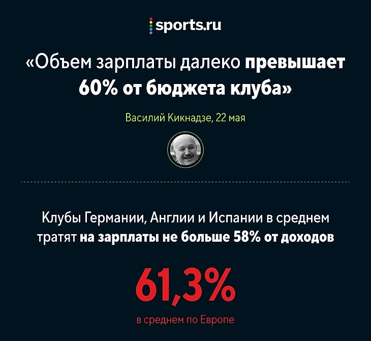 Что делать в таких условиях? У Кикнадзе, по его словам, два пути: «Нужно либо уменьшить бюджеты и изменить объем зарплаты, потому что этот показатель сильно превышает 60% бюджета клуба...» – сказал гендиректор в эфире «Футбола России».