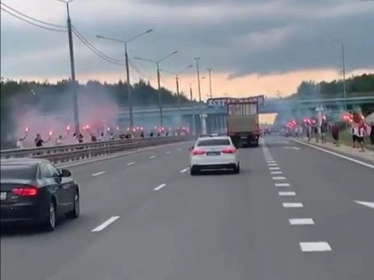 Во время проводов ультрас растянули баннер «Победа или смерть», устроили мощное файер-шоу и на пару минут перекрыли движение по проезду за стадионом. Во-первых, из-за дымовой завесы, во-вторых, потому что стояли на проезжей части. Красно-белый автобус, сопровождающие его патрульные машины и еще несколько авто остановились.