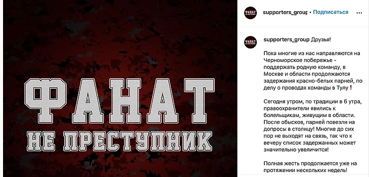 «Спартак» благодарит своих болельщиков за яркий перфоманс, которым команду проводили на первый после рестарта сезона матч. А также за встречу на въезде в Тулу. Мы не считаем, что действия болельщиков угрожали правопорядку, и просим правоохранительные органы отпустить задержанных», – написал капитан в инстаграме.