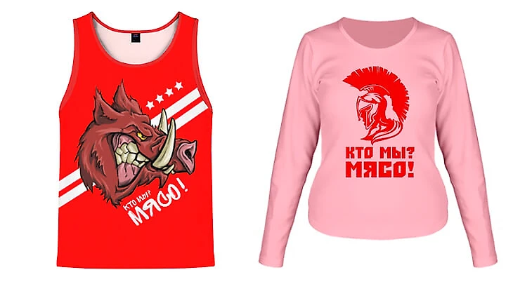 Беглый ресерч в Интернете показывает, что майка «Кто мы? Мясо!» все еще продается. Правда, не классическая, а с гладиатором или кабаном, в зеленой, желтой и синей расцветке. Есть даже женский лонгслив.
